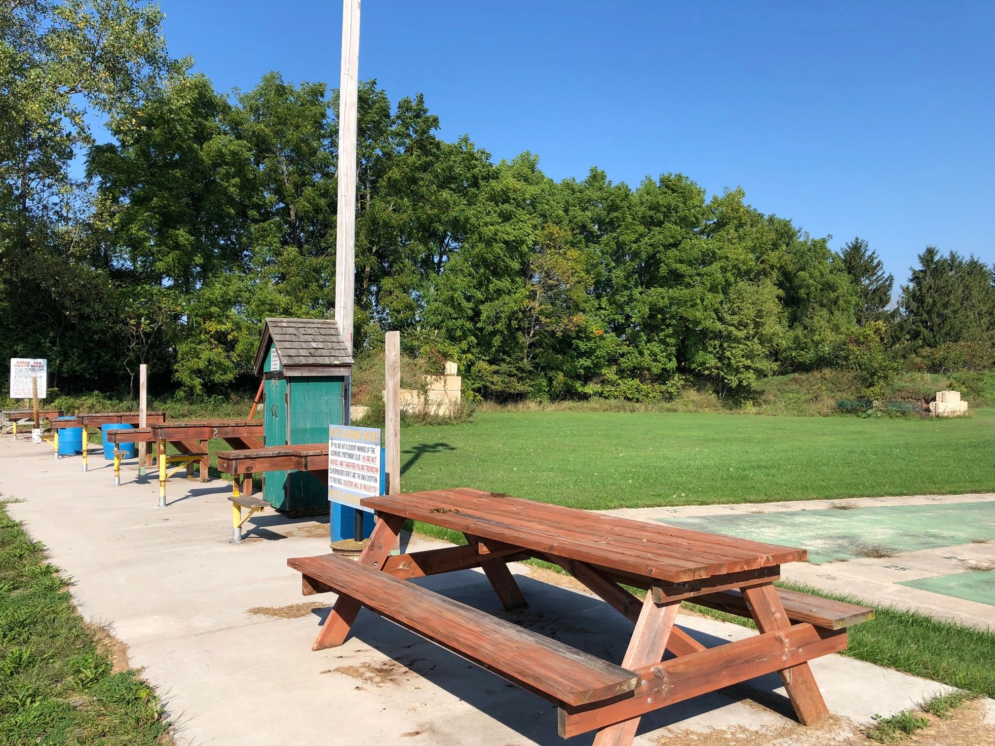 One is set at 30 meters, the other 2 berms are set at 50 & 100 yds. Shooting benches are adjustable for height and right or left-handed shooters.